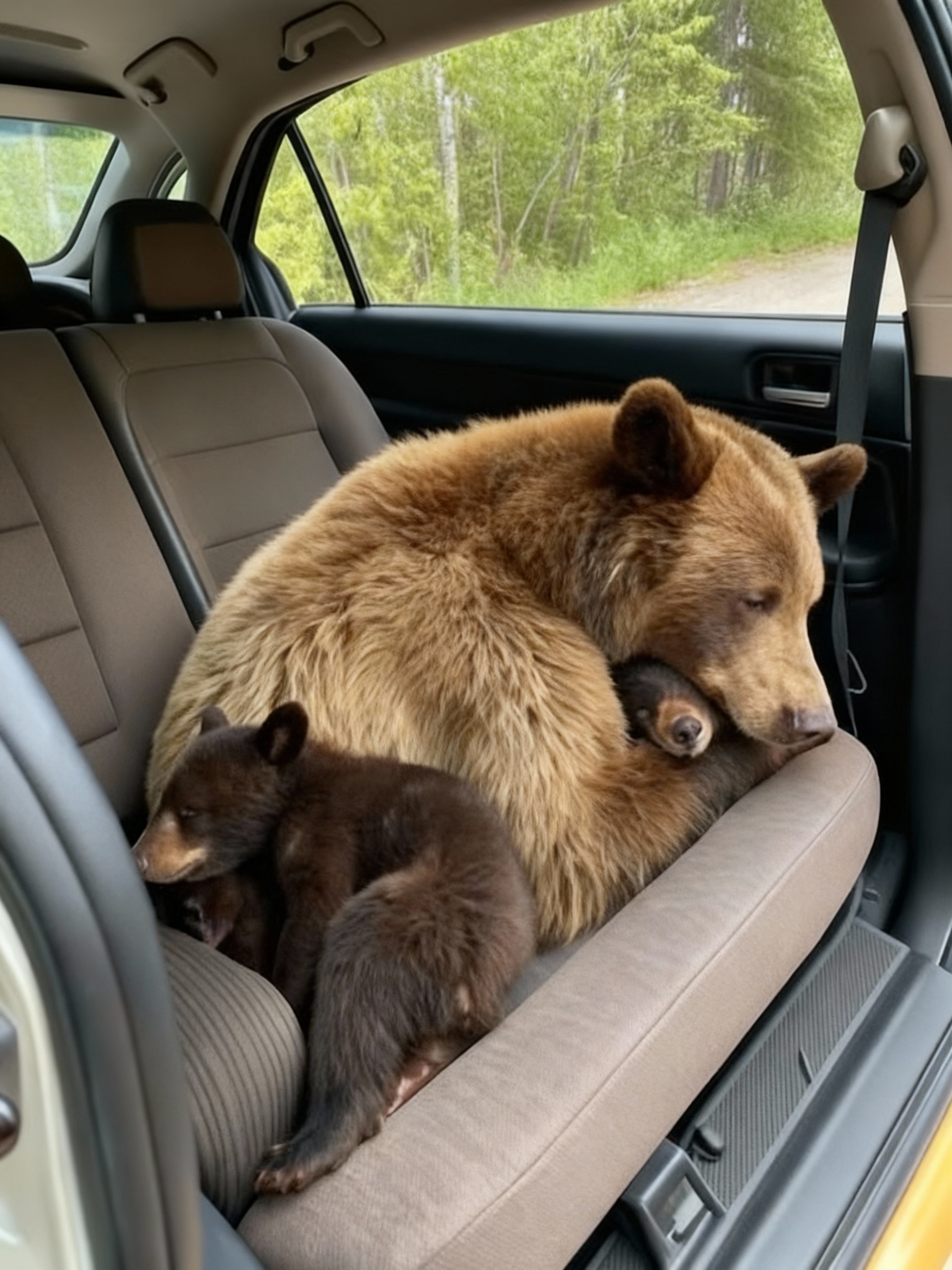 Amid the smoke and chaos, a police officer discovered a mother bear, her fur singed and trembling, cradling her lifeless cub inside a burned-out car. She could have run. She could have saved herself. But she didn’t.